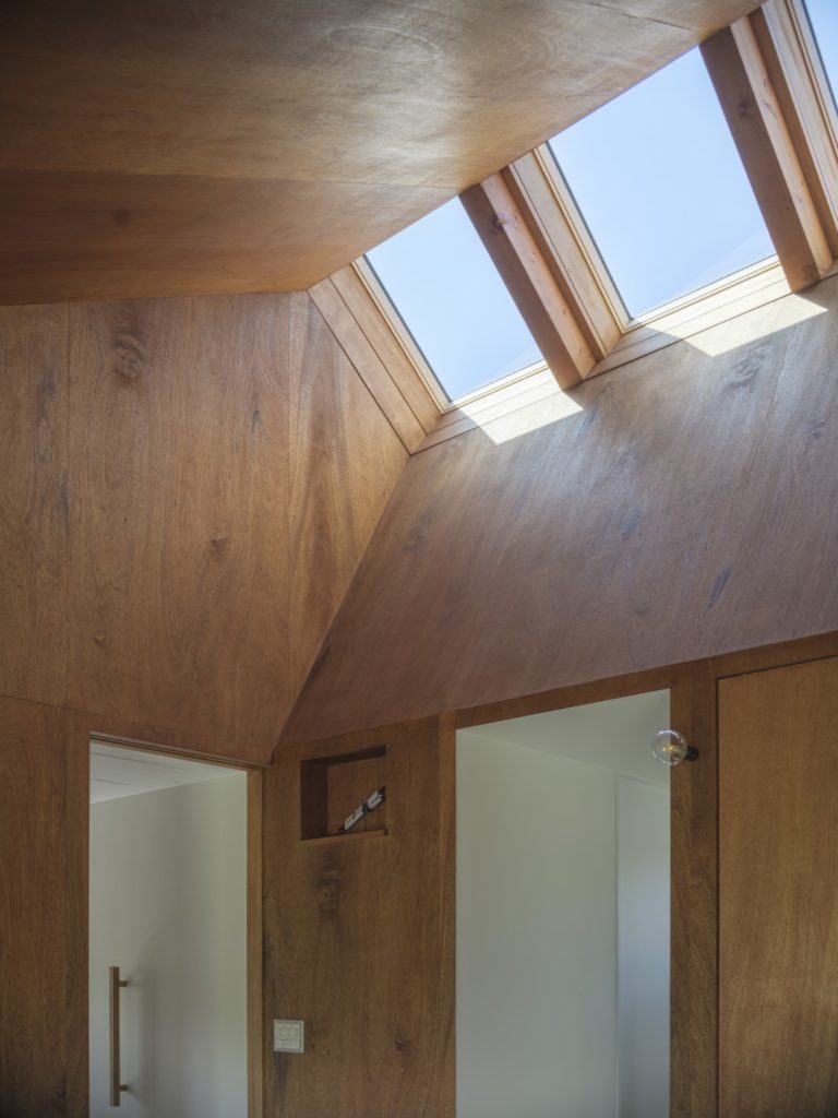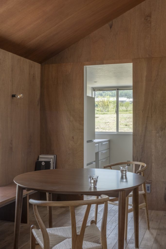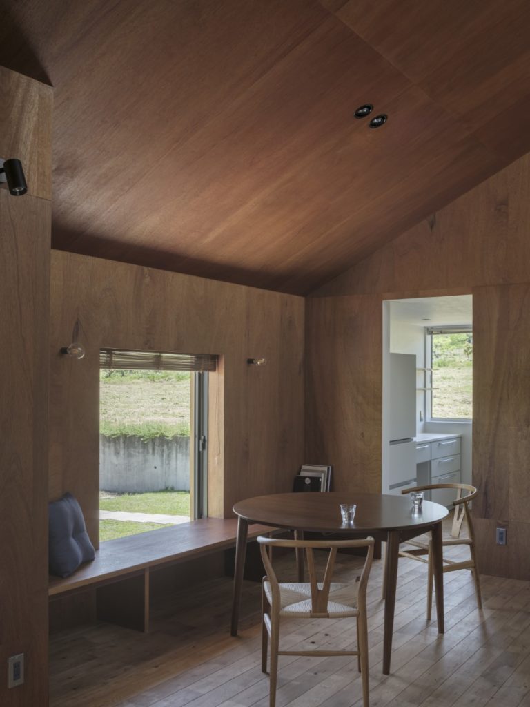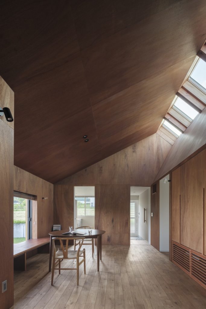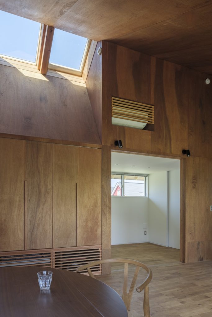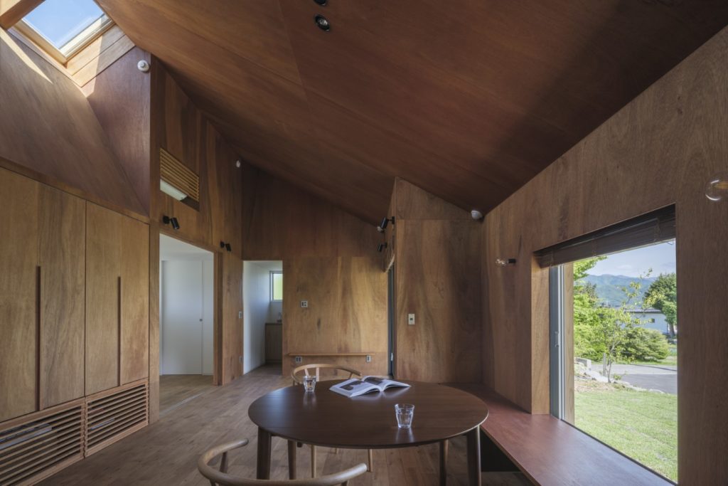 そしてダイニングも単調にならないように、濡れ縁を設けて庭とつながる場所、天窓から空を眺められる場所を設定し、季節や日々の変化を感じることができるようにしている。ちなみに天窓はクライアントの「小さい時から雲を眺めるのが好き」という話から取り入れた。